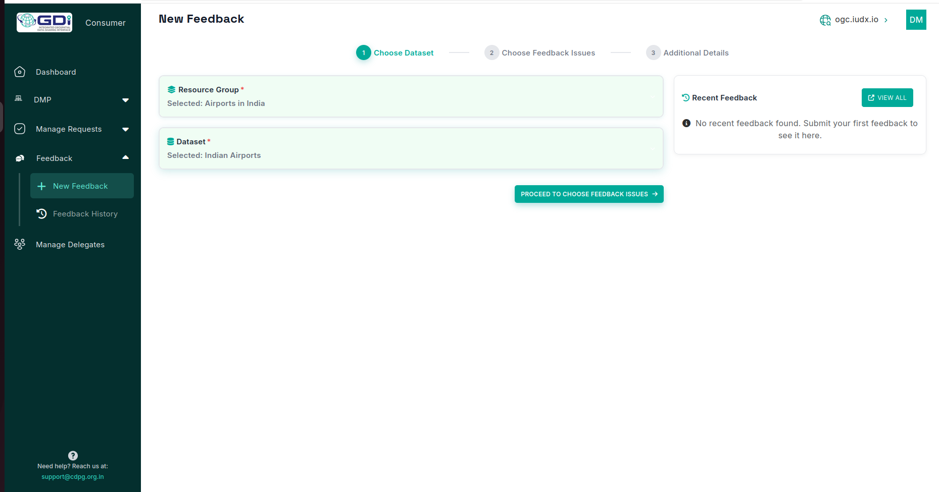 The feedback submission process in the GDI catalogue is initiated by consumers. In the feedback tab of the consumer panel, click on ‘new feedback’ option and the users first select the resource group and specific resource item (dataset), then choose from predefined data quality issues aligned with ISO 19157 standards, including sub-issues. Next, they can provide additional details for the selected issue, such as image attachments and comments, before submitting with their consumer information. The panel also features a feedback history tab that displays all raised issues along with their resolution status.
