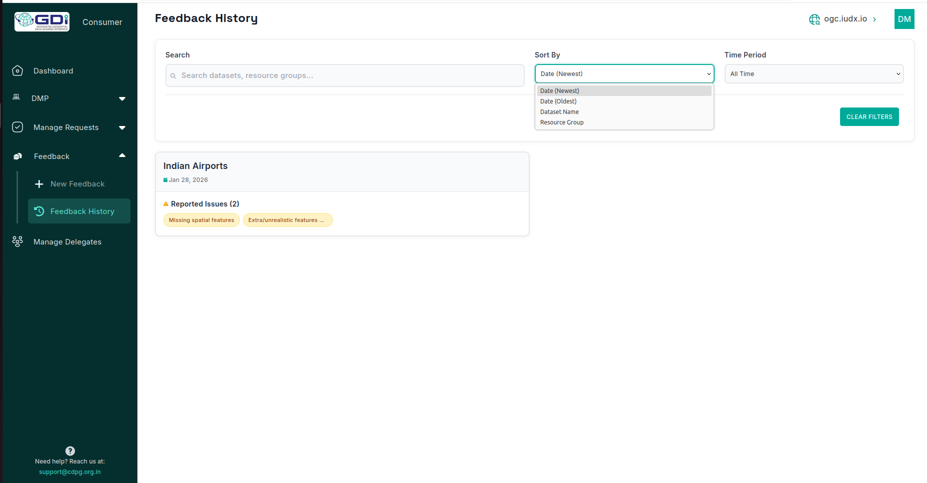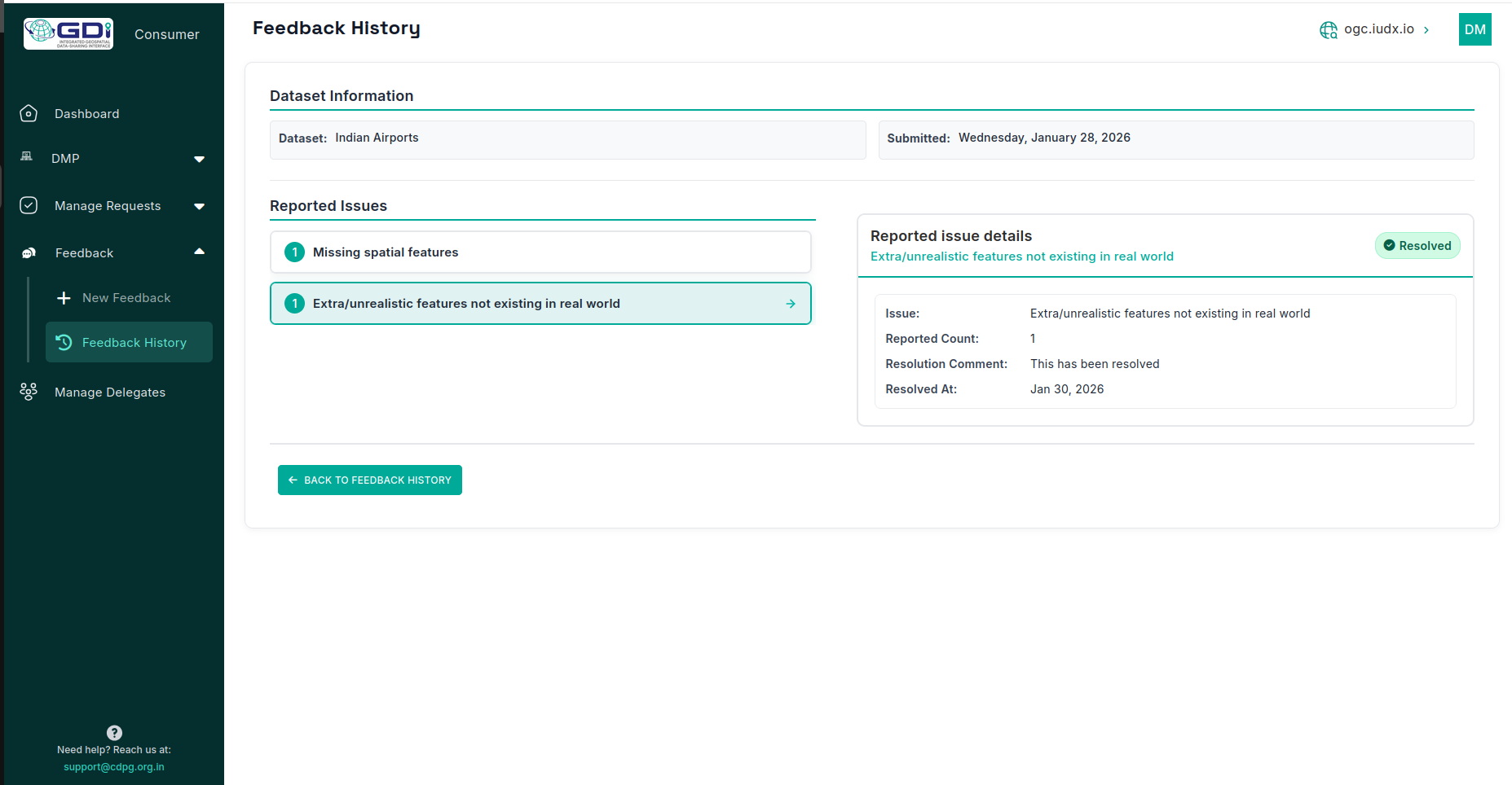 Each resource item in the GDI catalogue can be evaluated by a consumer driven feedback mechanism, through which consumers can submit issues related to that dataset. Once an issue is resolved by the provider, its status is updated to “resolved” and this change is reflected at the consumer’s end. For every resource item in the catalogue, the feedback icon enables a view that shows the total number of issues raised, how many users have raised them, and the detailed list of issues reported, along with a time‑series plot of the number of issues against date that indicates when issues were created, how many were raised on each date, when they were resolved, and how many were closed over time.