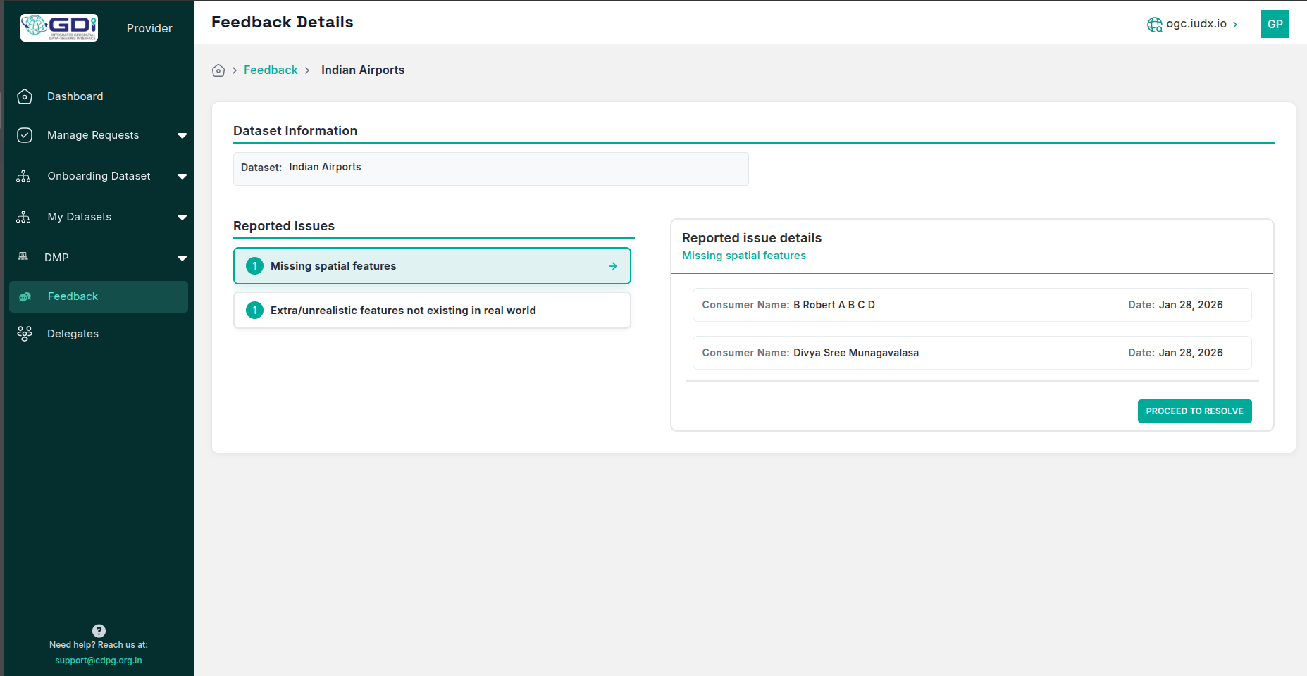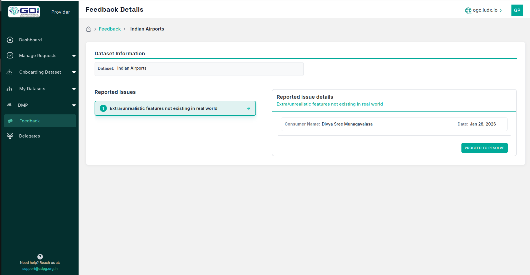 The provider dashboard facilitates efficient feedback resolution for reported data quality issues in the GDI catalogue. In the feedback tab, resource items (datasets) with raised issues are listed at the resource item level. Clicking a dataset reveals details on reported issues, sub-issues, and the consumer who raised them, while selecting an individual issue displays additional information such as comments and attached images.
